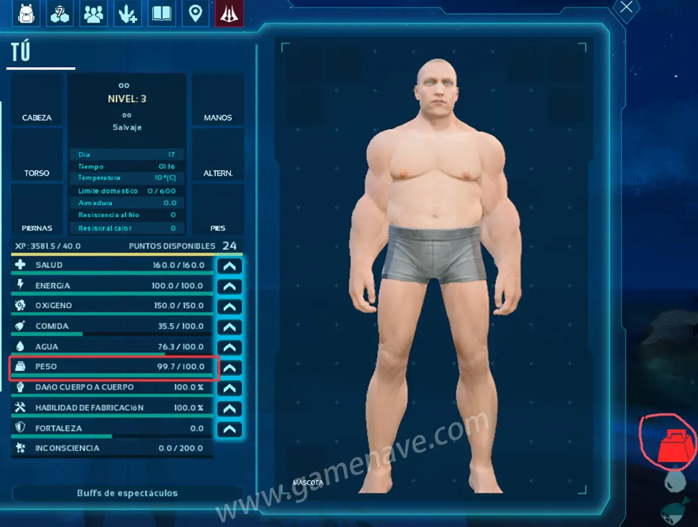 Si no quedan puntos disponibles, deberás soltar algunos objetos o guardarlos en cofres o en dinosaurios para reducir el PESO.